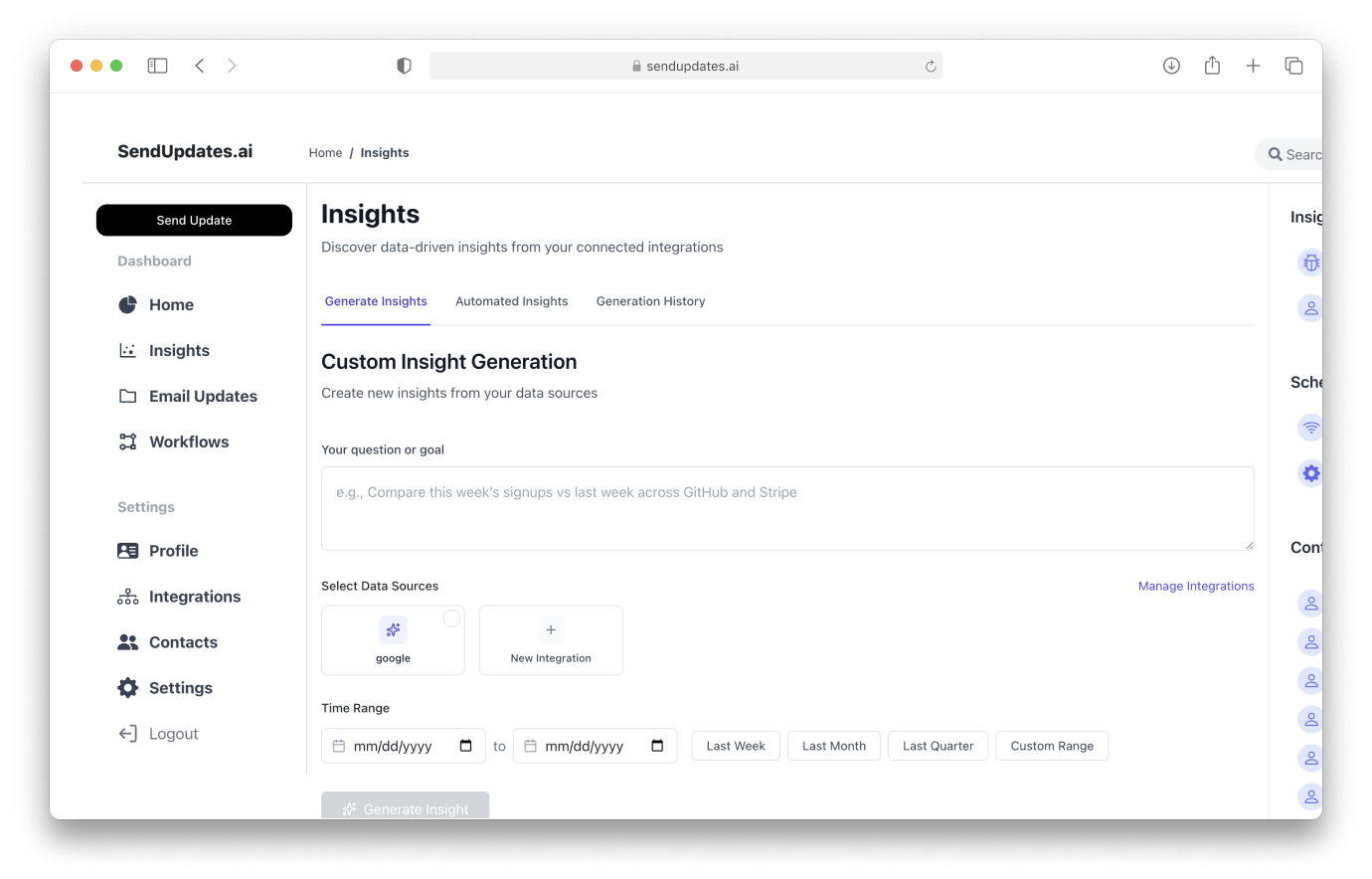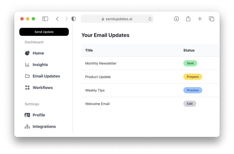 From investor updates to engineering or product standups, SendUpdates.ai collects the data, writes the narrative, and delivers it automatically on your schedule.